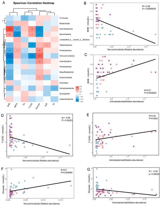 Correlation of faecal microbiota at the phylum level with clinical phenotype indices at three time points. * p < 0.05, ** p < 0.01, and *** p < 0.001. (A) Spearman’s correlation analysis between microbiome and phenotypic indicators. (B–G) Associations between the abundance of Verrucomicrobiota or Actinobacteriota and circulating BHB, T-CHO, or glucose concentrations in dairy cows based on Spearman’s correlation analysis. The blue dots represent 0 day samples, the orange dots represent +7 days samples, and the purple dots represent +14 days samples.