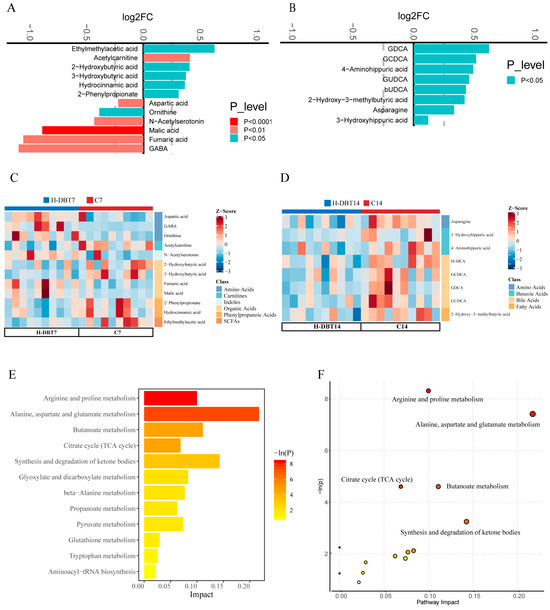 Compared with those of the C7 group, the contents of 4-aminobutanoate (GABA), fumaric acid, malic acid, N-acetylserotonin, ornithine, and aspartic acid (Asp) were significantly increased in the DBT7 group (p < 0.05). In contrast, the contents of 2-phenylpropionate, hydrocinnamic acid, BHB, 2-hydroxybutyric acid (2-HB), acetylcarnitine, and ethylmethylacetic acid were significantly reduced in the H-DBT group (p < 0.05; Figure 4A). The differential metabolite heatmap shows the distribution and classification of differential metabolites between groups (Figure 4C). To further explore the effects of DBT, KEGG pathway analysis was performed. The pathway analysis of the 12 significantly altered metabolites in the KEGG ‘Bos taurus’ database is shown in Figure 4E. Five of the metabolic pathways had p-values below 0.05, including arginine and proline metabolism (bta00330); alanine, aspartate, and glutamate metabolism (bta00250); citrate cycle (TCA cycle; bta00020); butanoate metabolism (bta00650); and synthesis and degradation of ketone bodies (bta00072; Figure 4F).