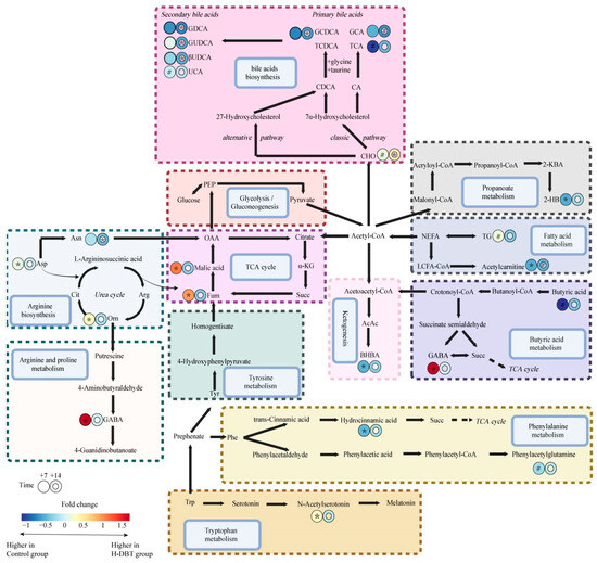 Compared with those of the C14 group, asparagine, 3β-ursodeoxycholic acid (bUDCA), glycoursodeoxycholic acid (GUDCA), 2-hydroxy-3-methylbutyric acid, glycodeoxycholic acid (GDCA), 3-hydroxyhippuric acid, 4-aminohippuric acid, and glycochenodeoxycholate (GCDCA) contents were significantly reduced in the H-DBT group (p < 0.05; Figure 4B). In this classification, four differential metabolites belonged to the bile acid (BA) class (Figure 4D). Significantly altered differential metabolites were subjected to KEGG enrichment analysis, and the pathways were enriched with p-values greater than 0.05.