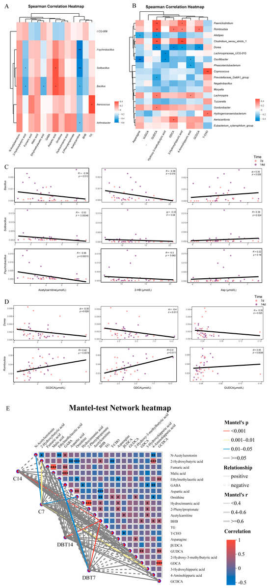 Correlation among phenotypes, genera, and serum metabolites. (A) Spearman’s correlation analysis of differential metabolites and relative abundance of differential genera (7 days). * p < 0.05, *** p < 0.001. (B) Spearman’s correlation analysis of differential metabolites and relative abundance of differential genera at the genus level (14 days). * p < 0.05, ** p < 0.01. (C) Scatterplot of associations between the relative abundance of Psychrobacillus, Bacillu, or Solibacillus and circulating acetylcarnitine, 2-HB, and Asp levels at two time points based on Spearman’s correlation analysis. (D) Scatterplot of associations between the relative abundance of Dore or Romboutsia and circulating GCDCA, GDCA, and GUDCA levels at two time points based on Spearman’s correlation analysis. (E) Mantel-test network heatmap. Links between gut microbial community and host phenotypes. The heatmap displays the relationships among differential metabolites based on Spearman’s correlation analysis. The line indicates the relationship of the gut microbiota (genus level) matrix with the blood variables matrix based on the Mantel test. The line colour indicates the p-value of the Mantel test, and the thickness of the line indicates the correlation coefficient. * p < 0.05, ** p < 0.01, and *** p < 0.001.