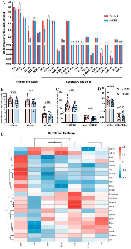 Bile acid metabolic profiles of plasma at 14 days after calving. (A) The bar graph shows the variation in 23 bile acids in plasma. # p< 0.1, * p < 0.05. CA, cholic acid; GCA, glycocholic acid; TCA, taurocholic acid; CDCA, taurocholic acid; GCDCA, glycochenodeoxycholate; TCDCA, taurochenodeoxycholate; DCA, deoxycholic acid; GDCA, glycodeoxycholic acid; TDCA, taurodeoxycholate; iso-DCA, isodeoxycholic acid; 3-DHCA, 3-dehydrocholic acid; 7-DHCA, 7-dehydrocholic acid; 12-DHCA, 12-dehydrocholic acid; LCA, lithocholic acid; GLCA, glycolithocholate; TLCA, taurolithocholic acid sulfate; 7-ketoLCA, 7-ketolithocholic acid; UDCA, ursodeoxycholic acid; GUDCA, glycoursodeoxycholic acid; TUDCA, tauroursodeoxycholic acid; bUDCA, 3β-ursodeoxycholic acid; UCA, ursocholic acid; bMCA, β-muricholic acid. (B) The concentration of total bile acid (TBA), primary bile acid (PBA), and secondary bile acid (SBA). (C) The concentration of 12-OH and non-12-OH BA. (D) The concentration of glycine-conjugated BA (GBA) and the ratio of GBA to TBA. (E) Spearman’s correlation analysis between 23 bile acids and phenotypic indicators. * p < 0.05.
