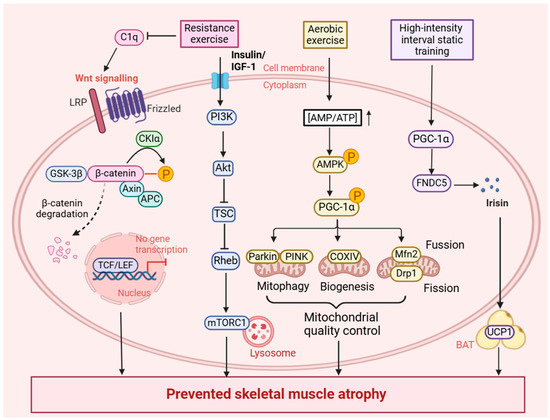 An experiment utilized three-month-old mice as models for sarcopenia, which were subjected to lifelong moderate-intensity treadmill running at 12 m/min for 55 weeks [18]. The results demonstrate that lifelong aerobic exercise activates the AMPK/PGC-1α signaling pathways, which helps counteract the age-related decline in mitochondrial fusion and fission biomarkers, enhances the Beclin1 and LC3-II/LC3-I ratio and decreases p62, and effectively promotes mitochondrial biogenesis, thereby improving mitochondrial quality control and delaying the onset of sarcopenia [18]. According to a previous study, resistance training in mice (three times a week for 12 weeks, climbing ladders) prevents muscle fibrosis and atrophy by down-regulating complement component 1q (C1q)-induced Wnt signaling (glycogen synthase kinase-3β/β-catenin), including β-catenin in satellite (Pax7/DAPI) and fibroblast (vimentin/DAPI) cells [17]. And resistance training may activate the PI3K-Akt-TSC signaling cascade to regulate mTORC1 signaling through Ras homolog enriched in brain (Rheb), which subsequently translocates to lysosomes, thereby playing a role in promoting protein synthesis by activating several translational and ribosomal components in skeletal muscle hypertrophy [20] (Figure 1).