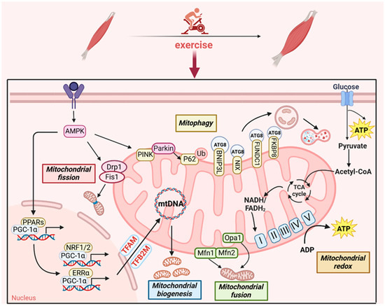 Exercise promotes mitochondrial homeostasis in sarcopenia. Regular exercise triggers AMPK signaling, leading to PGC-1α upregulation and activation. PGC1-α may form a transcriptional regulatory complex with PPARs to coactivate other transcriptional partners, such as NRF1/2 and ERRα, involved in mitochondrial biogenesis. Exercise-induced glucose catabolism is implicated in regulating mitochondrial redox to yield ATP. Exercise can also activate Parkin-dependent and ubiquitin-independent mitophagy to attenuate the impact of aging on muscle tissue. The fusion of the outer mitochondrial membrane is mediated by Mfn1/2, and Opa1 promotes the fusion of the inner mitochondrial membrane, together triggering mitochondrial fusion. Mitochondrial fission of the outer mitochondrial membrane is mediated by Drp1 and Fis1. PGC-1α, peroxisome proliferator-activated receptor-γ coactivator-1α; NRF1/2, nuclear respiratory factors 1 and 2; ERRα, estrogen-related receptor alpha; PPARs, peroxisome proliferator-activated receptors; TFAM, mitochondrial transcription factor A; TFB2M, mitochondrial transcription factor B2; mtDNA, mitochondrial DNA; AMPK, AMP-activated protein kinase; ATG8, autophagy-related protein 8; TCA, tricarboxylic acid cycle; Drp1, dynamin-related protein 1; Fis1, mitochondrial fission protein 1; Mfn1/2, mitofusin1/2; Opa1, optic atrophy 1; NADH, nicotinamide adenine dinucleotide; FADH, flavine adenine dinucleotide.