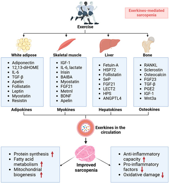 A growing body of evidence highlights that regular exercise serves as a non-invasive therapeutic approach and a highly effective intervention for addressing metabolic syndrome linked to sarcopenia [16]. The crucial reason for this is that exercise triggers the release of bioactive factors known as exerkines, which contribute to increased muscle anabolism, bone formation, mitochondrial function, glucose utilization, and fatty acid oxidation (FAO), ultimately alleviating sarcopenia [72]. Exerkines are secreted by various tissues, including white adipose tissue (adipokines), skeletal muscle (myokines), the liver (hepatokines), and bone (osteokines).