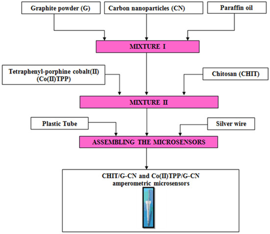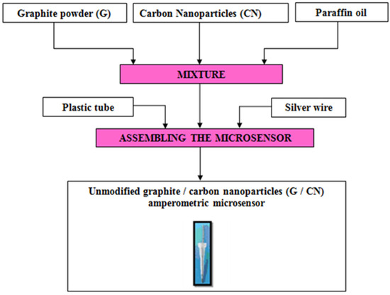 The fabrication of both unmodified and modified amperometric microsensors followed a well-established protocol previously detailed in our earlier research [24,25,26,27]. Accordingly, the protocol to design the three amperometric microsensors based on the graphite (G) and carbon nanoparticle paste mixture is described in Figure 1 and Figure 2.