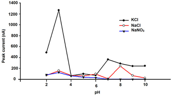 To optimize the analytical conditions, DPV anodic curves were obtained for solutions that contained 100 μmol L−1 (10−4 mol L−1) of quercetin (Q) using different supporting electrolytes in 0.2 mol L −1 of phosphate buffer solutions with pH values between 1 and 10. Three supporting electrolytes were used to optimize this parameter: 0.1 mol L−1 KCl, 0.1 mol L−1 NaCl, and 0.1 mol L−1 NaNO3. The influence of the pH and supporting electrolyte on the peak height was evaluated for the amperometric microsensors based on carbon materials (e.g., graphite (G) and carbon nanoparticles (CNs) unmodified and modified with chitosan (CHIT) and tetraphenyl-porphine cobalt(II) (Co(II)TPP)).