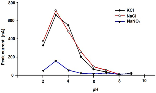 The results shown in Figure 4, Figure 5 and Figure 6 demonstrate that optimum responses are observed at pH 3.00 and 0.1 mol L−1 NaCl for the unmodified G-CN microsensor, and also at pH 3.00 and 0.1 mol L−1 KCl for the modified (CHIT/G—CN) and (Co(II)TPP)/G-CN microsensors.