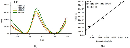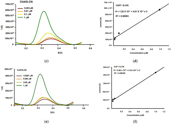 Figure 7 displays typical calibration peaks obtained with DPV for quercetin solutions in the range of 0.0001 to 1 mol/L, using each of the three sensor configurations: unmodified G-CN (Figure 7a,b), chitosan-modified G-CN (CHIT/G-CN, Figure 7c,d), and tetraphenylporphyrin cobalt(II)-modified G-CN (Co(II)TPP/G-CN, Figure 7e,f). The DPV measurements were performed at a scan rate of 50 mV s−1. The results demonstrate a direct proportionality between the DPV current response and quercetin concentration.