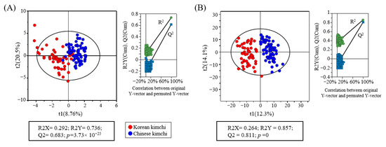 Partial least-squares discriminant analysis (PLS-DA) score plot of obtained kimchi metabolites analyzed using GC–MS (A) and UPLC-Q-TOF MS (B). The quality of PLS-DA models was evaluated by R2X, R2Y, Q2, and p-values, and validated by permutation test. R2X and R2Y indicate the goodness of fit, while Q2 reflects the predictive ability of the models.