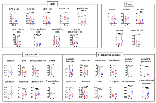 Comparison of relative abundance of kimchi metabolites. Box plots present the relative abundance of metabolites analyzed by GC–MS and UPLC-Q-TOF MS. The y-axis shows the normalized chromatogram intensity and x-axis shows the kimchi samples. K, Korean kimchi; C, Chinese kimchi. LPS, lipopolysaccharide; LPE, lysophosphatidylethanolamine; LPC, lysophosphatidylcholine. Statistical significance was determined by t-tests at p < 0.05 (*), p < 0.01 (**), p < 0.001 (***), and p < 0.0001 (****).