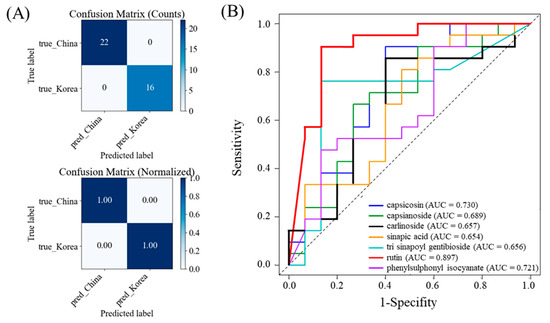 To evaluate the discriminative ability of major metabolites, logistic regression and ROC curve analyses were performed in R (Figure 4). The logistic regression model demonstrated a complete classification accuracy of 100% within the test dataset, accurately identifying all samples from the Chinese (n = 22) and the Korean (n = 16) (Figure 4A). To complement the AUC values, classification performance was evaluated at the optimal ROC threshold (Table S1); across the top markers, accuracy ranged from 0.639 to 0.889, sensitivity from 0.476 to 0.905, and specificity from 0.533 to 0.867. Rutin showed the highest classification performance with AUC of 0.897, indicating excellent ability to distinguish Korean and Chinese kimchi samples. Capsicosin (AUC = 0.730) and phenylsulphonyl isocyanate (AUC = 0.721) also demonstrated strong classification performance. Carlinoside (AUC = 0.670), capsianoside (AUC = 0.670), trisinapoyl gentiobiose (AUC = 0.656), and sinapic acid (AUC = 0.654) showed moderate discrimination capacity. The superior performance of rutin, capsicosin, and phenylsulphonyl isocyanate highlights their potential as key metabolites for distinguishing kimchi by origin. In particular, rutin showed excellent classification accuracy, suggesting that it could serve as a reliable single marker. Nevertheless, metabolites such as capsicosin and sinapic acid derivatives, despite lower individual AUCs, may contribute synergistically to multi-marker classification models, thereby enhancing robustness and predictive reliability [47,48].