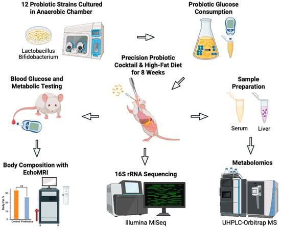 In this study, we aim to develop a novel precision probiotic cocktail for increased gut glucose consumption that may improve blood glucose control and weight loss in the host. We hypothesize that bacterial strains with enhanced capabilities to consume glucose will effectively reduce the bioavailability of these sugars to the host. As a result, they may regulate blood glucose levels and potentially help mitigate adverse health effects of chronic high sugar intake. To fully investigate the metabolic effects of the precision probiotic cocktail, we will perform untargeted metabolomic analyses on collected serum and liver tissue using liquid chromatography-mass spectrometry (LC-MS) [26,27,28,29,30,31]. Additionally, mouse gut microbiota will be extracted for 16S rRNA sequencing to assess probiotic interactions and microbiome health [32]. Our objective is to demonstrate how probiotic intake can modulate the negative effects of a high-fat diet in elevating blood glucose levels and potentially improve host weight maintenance and biomarkers of metabolic health. In doing so, the risk for developing hyperglycemic-related chronic conditions can be potentially attenuated.
