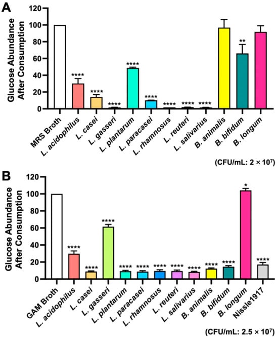 24 h glucose consumption by bacterial strains in vitro. Probiotics were incubated in (A) MRS Broth at a pH of 6.0 with a CFU/mL of 2 × 107, or (B) GAM Broth at a pH of 6.99 with a CFU/mL of 2.5 × 107. The graphs are presented as mean ± std. **** p < 0.0001, ** p < 0.01, * p < 0.05 vs. sterile broth, respectively.