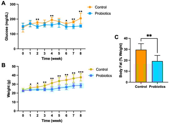 (A) Fasting blood glucose concentration, (B) body weight, and (C) body fat percentage of C57BL/6J male mice on a high-fat diet. Mice received the precision probiotics (n = 6; blue) or vehicle PBS (n = 6; orange) via oral gavage for eight weeks. The graphs are presented as mean ± std. *** p < 0.001, ** p < 0.01, * p < 0.05.