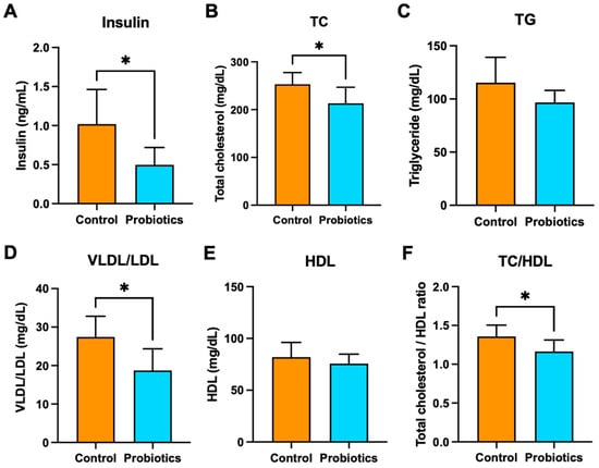 Effects of the probiotic cocktail on additional circulating biomarkers of metabolic health were measured. Terminal fasting serum insulin, total cholesterol (TC), triglyceride (TG), very-low-density and low-density lipoprotein (VLDL/LDL), and high-density lipoprotein (HDL) levels in the groups are shown in Figure 4. Insulin levels were nearly 50% lower (p < 0.05) in the probiotic group compared to the controls (Figure 4A). The probiotics also appeared to have a beneficial effect on TC, TG, and VLDL/LDL concentrations, which were all significantly lower compared to the controls (p < 0.05) (Figure 4B–D). There was no significant difference in HDL concentrations between the two groups (Figure 4E), but the probiotic group had a significantly lower TC/HDL ratio (p < 0.05) (Figure 4F).