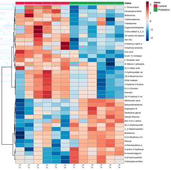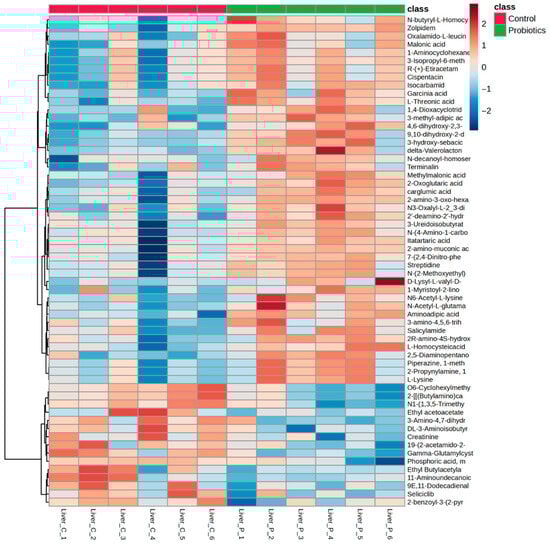 Heatmap of the significant liver metabolites (p < 0.05) comparing the control and probiotic groups.