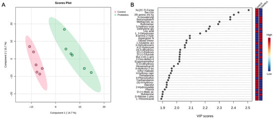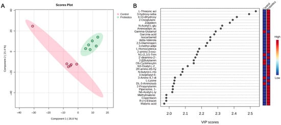 (A) PLS-DA score plot and (B) variable importance projection scores (VIP) comparing serum samples from the control and probiotic groups. Each dot in the PLS-DA score plot represents a serum sample at 8 weeks from each group. The directionality and influence of metabolites are depicted as a VIP score.