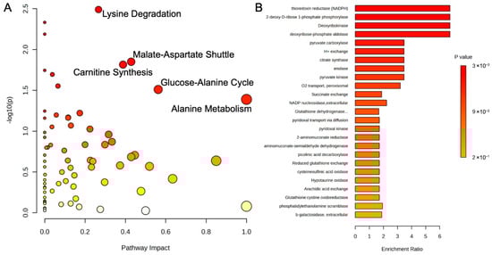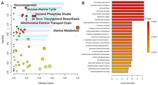(A) Metabolic pathway analysis and (B) enrichment analysis of estimated enzyme activity of liver metabolites using MetaboAnalyst 6.0. The metabolic pathways are represented as circles according to their scores of enrichment (vertical axis, shade of red) and topology (pathway impact, horizontal axis, circle diameter). Enzyme enrichment is plotted as enrichment ratio, and more significant p-values are denoted by a darker shade of red.