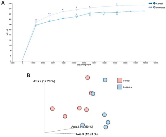 Terminal fecal samples from C57BL/6J mice were collected to evaluate the probiotic effects on gut microbiota. In Figure 11A, the α-diversity quantifications demonstrated a significant change in the probiotic group, indicating improved evolutionary relationships within the microbiota. In Figure 11B, β-diversity of the control and probiotic groups is depicted in a principal coordinate analysis (PCoA) score plot. Clear separation between the groups can be observed with principal coordinate axis 1 representing the largest variation in microbial composition at 46.50% and coordinate axes 2 and 3 carrying 17.20% and 12.91%, respectively.