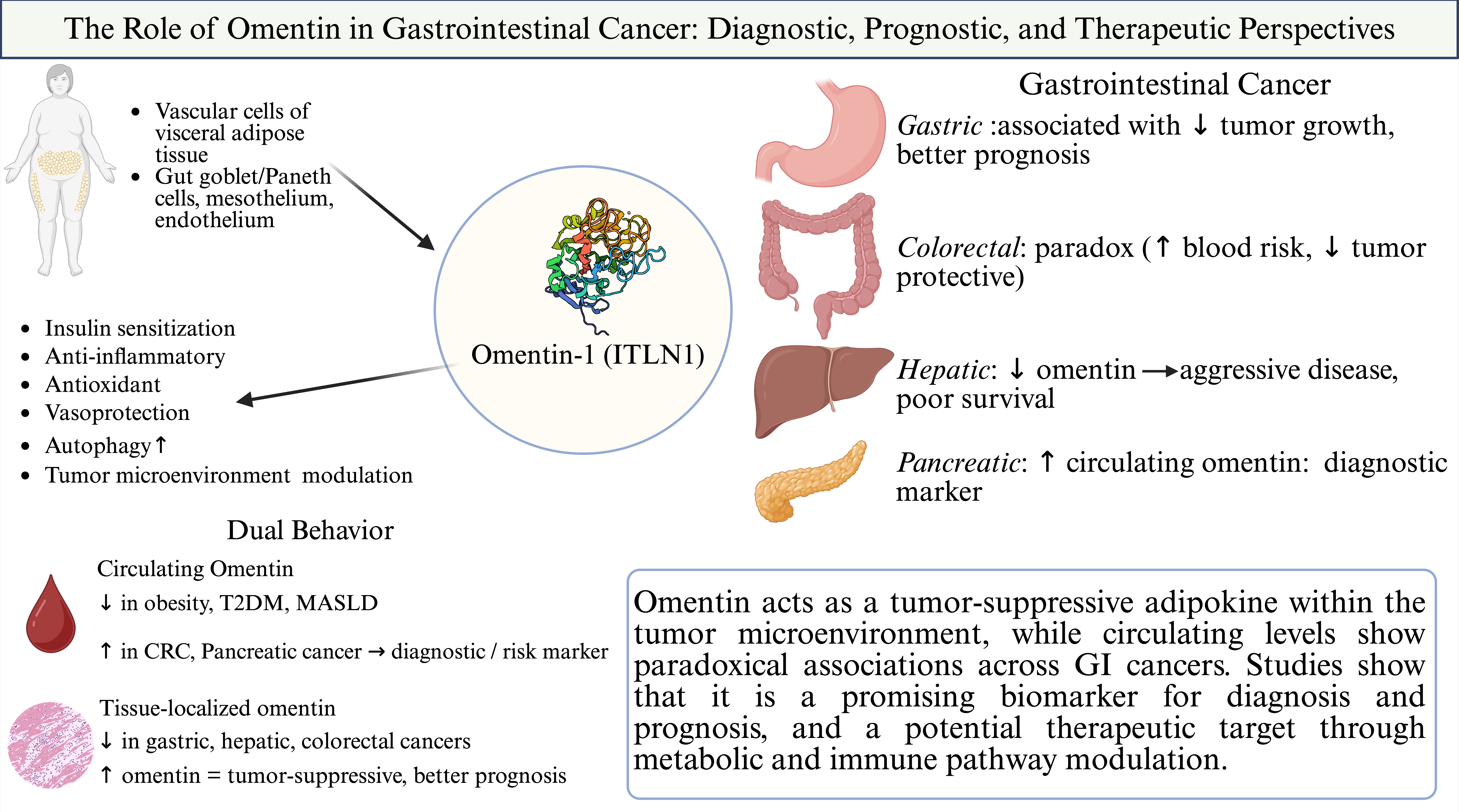 Zhang et al., 2020 [60] | CRC | CRC tissue + SW480 cells | Tumors overexpress omentin-1; secreted in autocrine/paracrine fashion | Context-dependent role | Targeting tumor-derived omentin alters CRC progression |