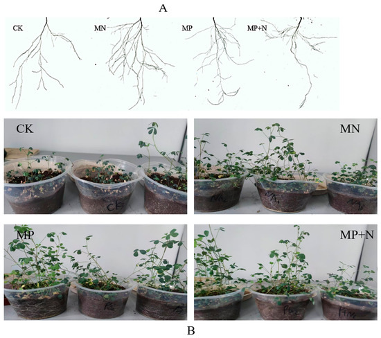 Preliminary experimental images: (A). root system morphology of alfalfa under different treatments; (B). potting experiment of alfalfa under different treatments.