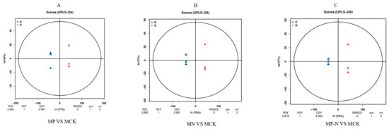 (A) MP vs MCK; (B) MN vs MCK; (C) MP-N vs MCK; OPLS-DA score plot. The x-axis (t1) represents the predictive component (between-group variance), and the y-axis (to1) represents the orthogonal component (within-group variance). The y-axis percentage indicates this component’s proportion in the total variance. The parameters of the model are noted below the figure, including R2X, R2Y, Q2Y, RMSEE (root mean square error), pre (number of predictive components), and ort (number of orthogonal components). The x-axis in the figure represents the correlation between the permutation groups and the original model groups, and the y-axis represents the values of R2Y or Q2Y (where the R2Y and Q2Y at x-axis value 1 are the values of the original model). The blue and red dots represent the R2Y and Q2Y of the permuted models, respectively, and the two dashed lines are the regression lines fitted for R2Y and Q2Y.
