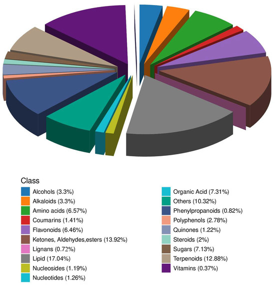 Three-dimensional pie chart illustrating the composition of metabolite classes. The drawing was carried out using the R language software (3.6.1); each color represents a different metabolic category, and the area of the color block indicates the proportion of that category.