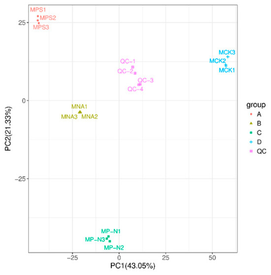 Metabolite PCA analysis (Figure 4) revealed a clear separation between the MP, MN, MP–N treatment groups and the control group (CK), indicating significant differences in metabolites among the four groups, with good clustering and high discrimination of the samples (Table S1). The first principal component (PC1) explained 43.05% of the variance in the original dataset, and the separation of MP–N, MN from MP, and CK treatments was observed on the first principal component. On the second principal component, CK was separated from the other three treatment groups, and this principal component explained 17.2% of the variance in the original dataset.