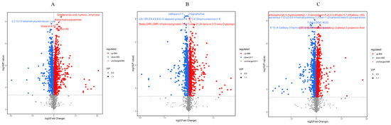 (A) MP vs MCK; (B) MN vs MCK; (C) MP-N vs MCK; Volcano plot of differential metabolites. Blue dots represent downregulated, differentially expressed metabolites, red dots represent upregulated, differentially expressed metabolites, and gray dots represent metabolites detected but with no significant difference. In addition, the top 5 qualitatively identified metabolites, ranked by p-value, are labeled in the figure.