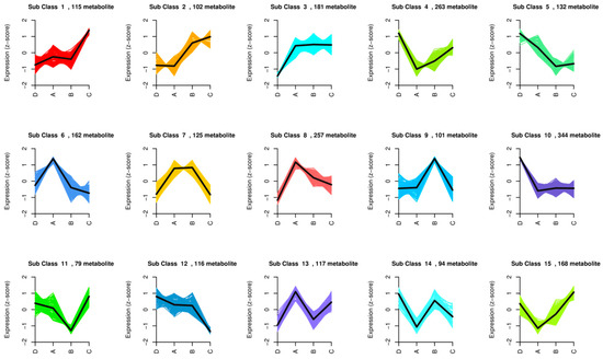 K-means clustering trend chart of differential metabolite set. The x-axis represents the grouping, and the y-axis represents the quantitative value of metabolites. Different colored lines represent the average change trend of the content of each k-means clustered metabolite between groups; Group A indicates MP treatment; Group B indicates MN treatment; Group C indicates MP–N treatment; Group D indicates CK treatment.