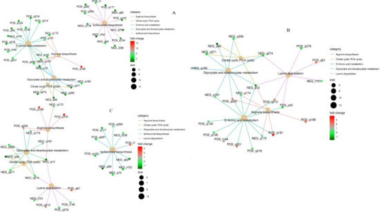 Differential metabolites interact within biological systems, forming distinct pathways. KEGG database annotation of these differential metabolites was performed, and pathway entries with the highest number of annotated differential metabolites were selected to construct a summary network diagram (Figure 7). In MP vs. CK (Figure 7A), five target pathways with significant impact from differential metabolites were identified: Arginine biosynthesis, Citrate cycle (TCA cycle), D-Amino acid metabolism, Glyoxylate and dicarboxylate metabolism, and Isoflavonoid biosynthesis. L-Citrulline exhibited a fold change of 16.38 within the Arginine biosynthesis pathway, indicating upregulation. In MN vs. CK (Figure 7B), five target pathways with significant impact from differential metabolites were identified: Arginine biosynthesis, Citrate cycle (TCA cycle), D-Amino acid metabolism, Glyoxylate and dicarboxylate metabolism, and Lysine degradation. Upregulation was observed for L-Lysine (2.04-fold), L-Histidine (2.16-fold), L-Glutamine (1.85-fold), L-Citrulline (2.43-fold), L-Arginine (3.85-fold), Allysine (6-Oxo Dl-Norleucine) (2.45-fold), and 1-Pyrroline-4-hydroxy-2-carboxylic acid (1.69-fold). In MP-N vs. CK (Figure 7C), five target pathways with significant impact from differential metabolites were identified: Arginine biosynthesis, Citrate cycle (TCA cycle), D-Amino acid metabolism, Glyoxylate and dicarboxylate metabolism, and Lysine degradation. Upregulation was observed for Medicarpin 3-O-glucoside-6′-malonate (2.10-fold), L-Citrulline (2.77-fold), L-Arginine (3.31-fold), and Allysine (6-Oxo Dl-Norleucine) (2.15-fold).