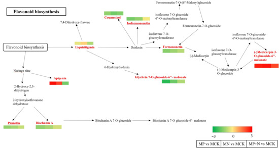 Based on the previous analysis, the shared differential metabolic pathway among all groups was identified as Flavonoid biosynthesis within the Biosynthesis of other secondary metabolites pathway [26] (Figure 8). Several differential metabolites were commonly observed in this pathway across all groups, including significantly increased levels of Formononetin, Isoformononetin, Biochanin A, Apigenin, 6″-O-Malonylglycitin, and Medicarpin 3-O-glucoside-6′-malonate. The primary compounds involved in the upregulation of these metabolites were Formononetin, Malonylglycitin, Biochanin A, Apigenin 4′,5,7-Trihydroxyflavone, Isoformononetin 4′-Hydroxy-7-methoxyisoflavone, and Medicarpin 3-O-glucoside-6′-malonate.