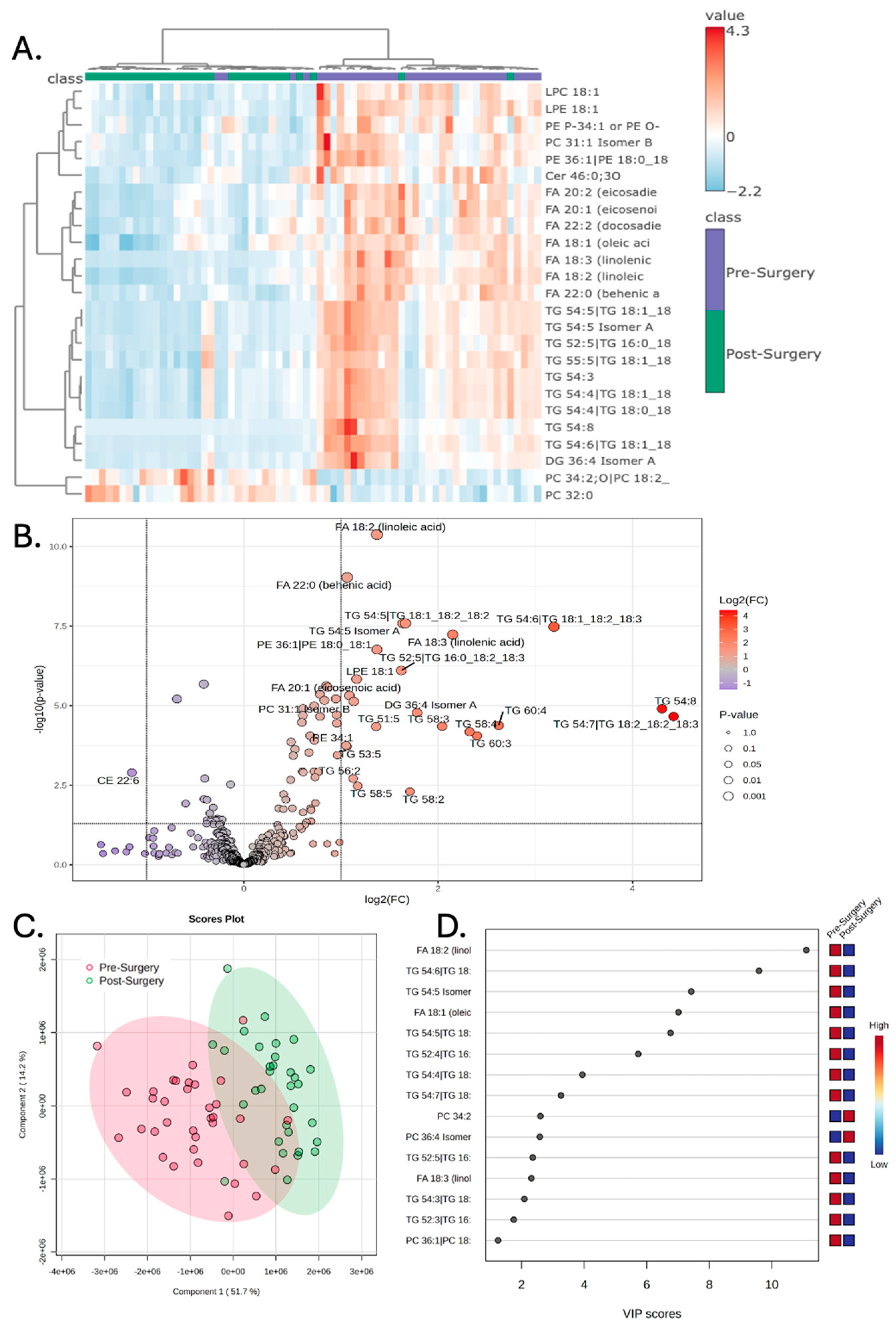 3.2. Surgery Alters the Plasma Lipidome