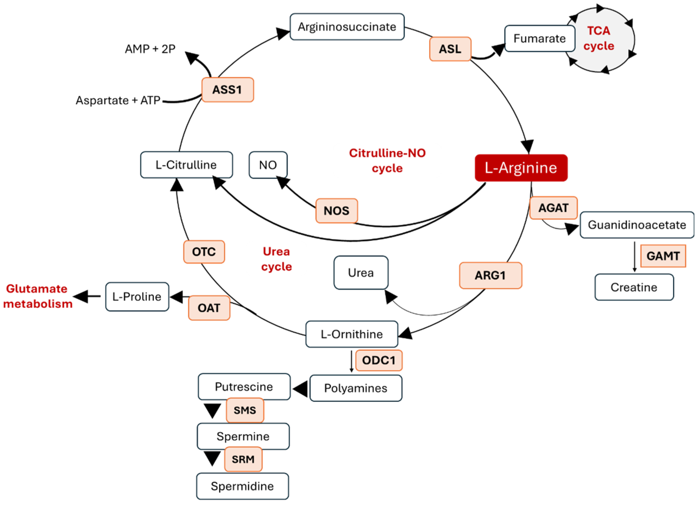 - Fung, T.S.; Ryu, K.W.; Thompson, C.B. Arginine: At the crossroads of nitrogen metabolism. EMBO J. 2025, 44, 1275–1293. [Google Scholar] [CrossRef]