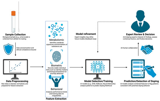 Among the most promising applications is the fusion of metabolomic, biometric, and behavioral data using AI. Metabolomics has emerged as a promising tool in anti-doping efforts, enabling the identification of metabolic perturbations in athletes that may indicate the use of prohibited substances [27]. By serving as a high-throughput screening approach, metabolomics can highlight individuals exhibiting atypical metabolic profiles, potentially resulting from doping practices [27]. Within this field, steroidomics—a specialized branch focusing on the comprehensive analysis of steroidal metabolites—has already demonstrated utility in characterizing steroidal signatures and detecting anabolic androgenic steroid (AAS) misuse [27]. Steroidomics employs a semi-targeted strategy to identify direct biomarkers indicative of AAS administration, offering enhanced sensitivity and specificity compared to conventional methods [27]. When integrated with biometric data such as sleep patterns, heart rate variability, or training loads—often collected through wearable devices—ML models can identify physiological discrepancies that may signal illicit drug use [91,92].