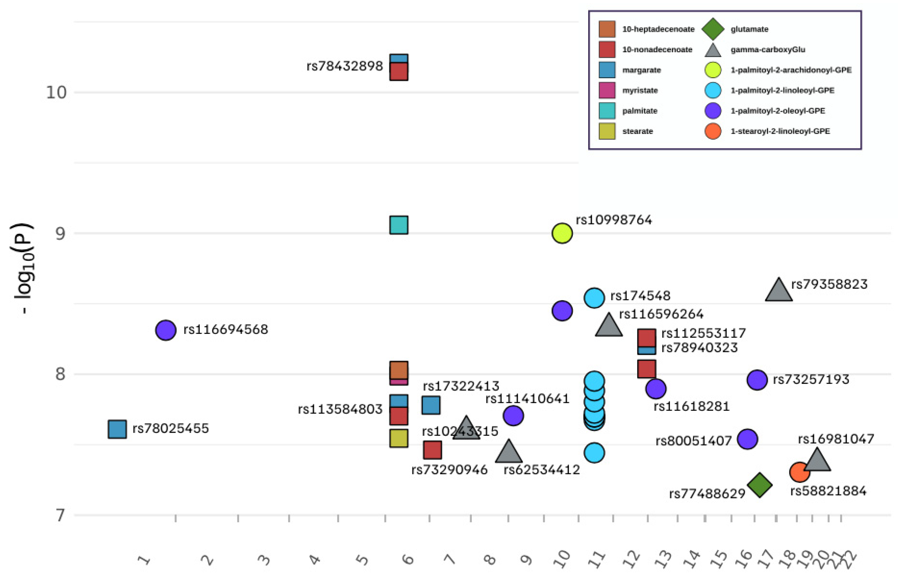 Figure 1. Genome-wide scan for metabolite quantitative trait loci (mQTLs) of 13 metabolites in BPRHS. Twelve of thirteen metabolites exhibited associations that passed the threshold of statistical significance at 38 loci. SNPs labeled with an rs identifier are those with regional peak association signals for the indicated metabolite. The x-axis indicates genome position by chromosome. SNP rs10998764 (Chr 10) had peak signals for both 1-palmitoy-2-arachidonoyl-GPE and 1-palmitoyl-2-oleoyl-GPE, and rs78432898 (chr 6) had peak signals for several fatty acids. For the plotted symbols, squares are for fatty acids, circles are for glycerophosphoethanolamines (GPEs), triangle represents gamma-carboxyglutamate, and the diamond is for the amino acid glutamate.