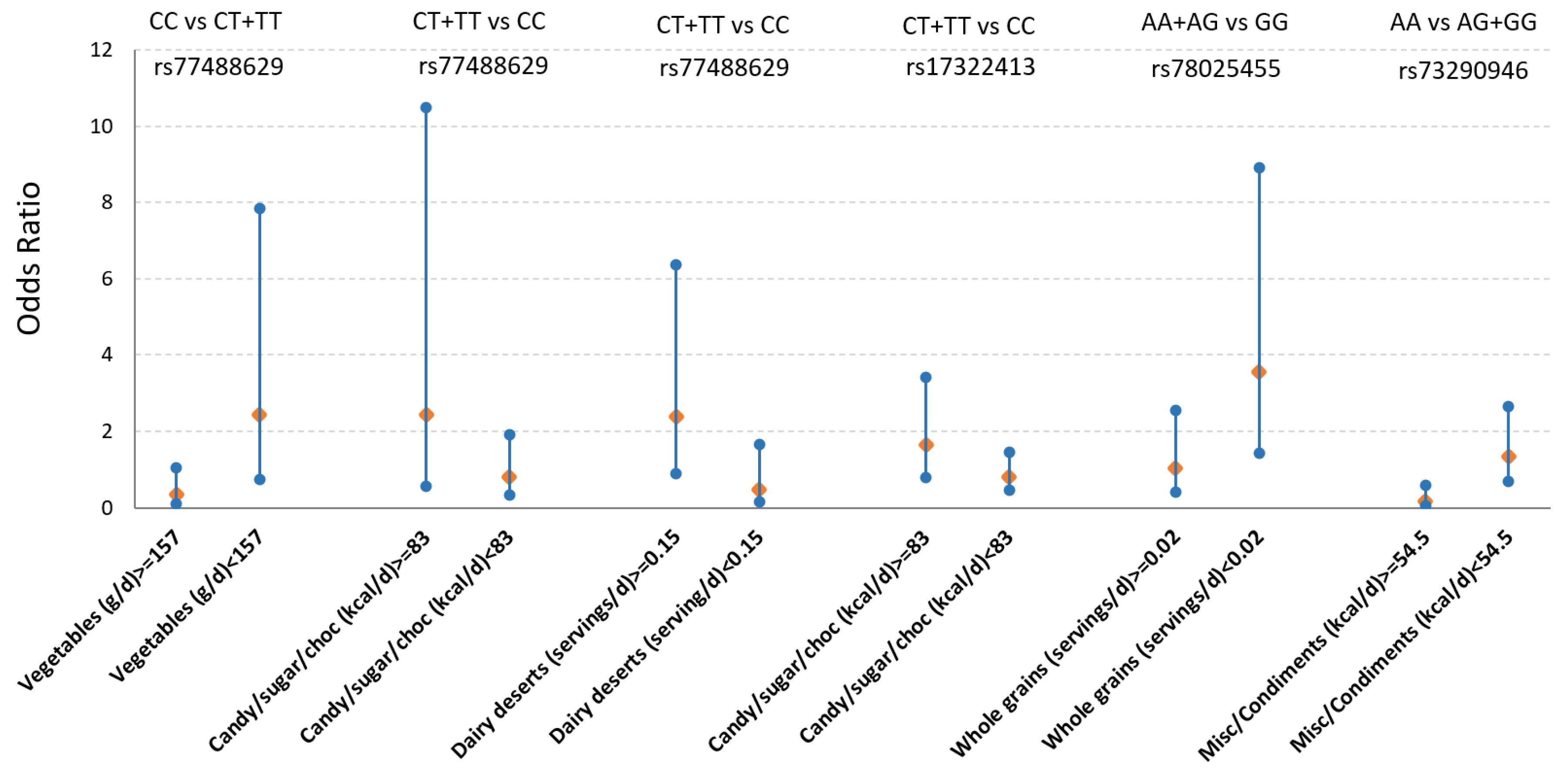 Figure 2. Interaction between mQTLs and food groups on type 2 diabetes. Odds ratios were calculated for the comparison of two genotype groups (i.e., dominant model) using a logistic regression model when applying the threshold of food intake mean of the population, while adjusting for potential confounders (sex, age, alcohol use, smoking, physical activity, total energy intake, education, and population structure). Orange diamonds indicate odds ratios and blue lines indicate the lower and upper 95% ranges. These six interactions between the four mQTLs (SLC47A1-rs77488629, ZNF815P-rs17322413, ID3-rs78025455, TMEM106B-rs73290946) and five food groups were significant after multiple testing correction with a p value < 0.002 (Table S1).