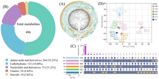 Quantitative analysis of metabolite distribution across regions (Figure 1C) demonstrated minimal variation in total metabolite counts. Chongqing (CQ) exhibited the highest count (484 metabolites), followed by Yunnan (YN), Hubei (HB), Guangxi (GX), and Guizhou (GZ). Sichuan (SC) showed the lowest count (474 metabolites). Cross-regional analysis identified 434 metabolites shared across all six regions, with the other 62 metabolites overlapping in 2–5 regions. Importantly, no region-specific metabolites were detected.