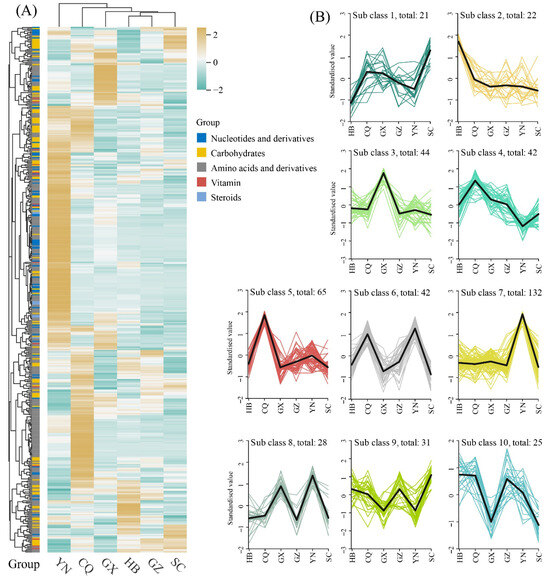 To further characterize differential patterns, K-means clustering analysis (Figure 2B) partitioned DAMs into 10 subclasses with distinct accumulation profiles. Subclass 7 contained the largest DAM cohort (132 metabolites), showing high accumulation in Yunnan (YN) versus low abundance in other regions. Subclasses 6 (42 DAMs) and 8 (28 DAMs) demonstrated similar YN-specific enrichment but with additional high accumulation in Chongqing (CQ) and Guangxi (GX), respectively. Subclass 5 ranked second in DAM quantity (65 metabolites), exhibiting CQ-specific accumulation with minimal presence elsewhere. Remaining subclasses contained smaller DAM cohorts (20–40 metabolites per group), each displaying unique geographical accumulation signatures.