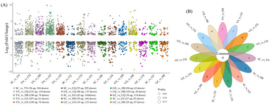 Petal Venn diagram analysis (Figure 3B) identified no universally shared DAMs across all 15 comparisons. However, 11 comparison groups (excluding CQ_vs_HB, GZ_vs_HB, SC_vs_GZ, and YN_vs_GX) contained unique DAMs. Particularly, SC_vs_HB showed the highest count of unique DAMs (5 metabolites), highlighting region-specific metabolic signatures.