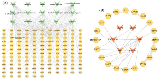 Analysis of putative targets for metabolites in H. cordata cultivated in different geographical regions. (A) Interaction network between putative targets and metabolites. (B) Protein–protein interaction (PPI) network of putative targets. Green shapes represent metabolites and orange-yellow shapes represent putative targets.
