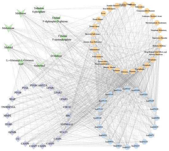 To elucidate the relationships among candidate metabolites, putative targets, diseases, and pathways, we constructed an integrative regulatory network (Figure 6). The analysis identified 9 metabolites associated with 27 diseases, which were further linked to 22 key targets from the PPI results and the top 20 enriched pathways. Based on Maximal Clique Centrality (MCC) scoring, the network prioritized 5 core metabolites (L-α-Glutamyl-L-Glutamic Acid, Maltitol, D-Maltose, Maltotriose, and Cytidine 5′-monophosphate), 5 pivotal targets (STAT3, HSP90AA1, CASP3, CASP8, and SRC), 3 disease modules (Infections, Neoplasms, Hyperphagia), and 2 key pathways (hsa05200: Pathways in cancer; hsa04217: Necroptosis).