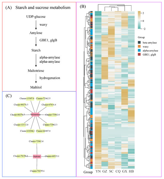 As illustrated in the metabolic pathway (Figure 8A), UDP-glucose is converted to amylose through waxy-mediated catalysis, subsequently forming starch via the enzymatic actions of GBE1/glgB. This starch is then hydrolyzed by alpha-amylase or beta-amylase to yield maltotriose, which undergoes hydrogenation to form maltitol. Transcriptomic analysis revealed 178 differentially expressed genes (DEGs) in this pathway, with their distinct expression patterns across geographical cultivation regions being visualized through heatmap analysis (Figure 8B).