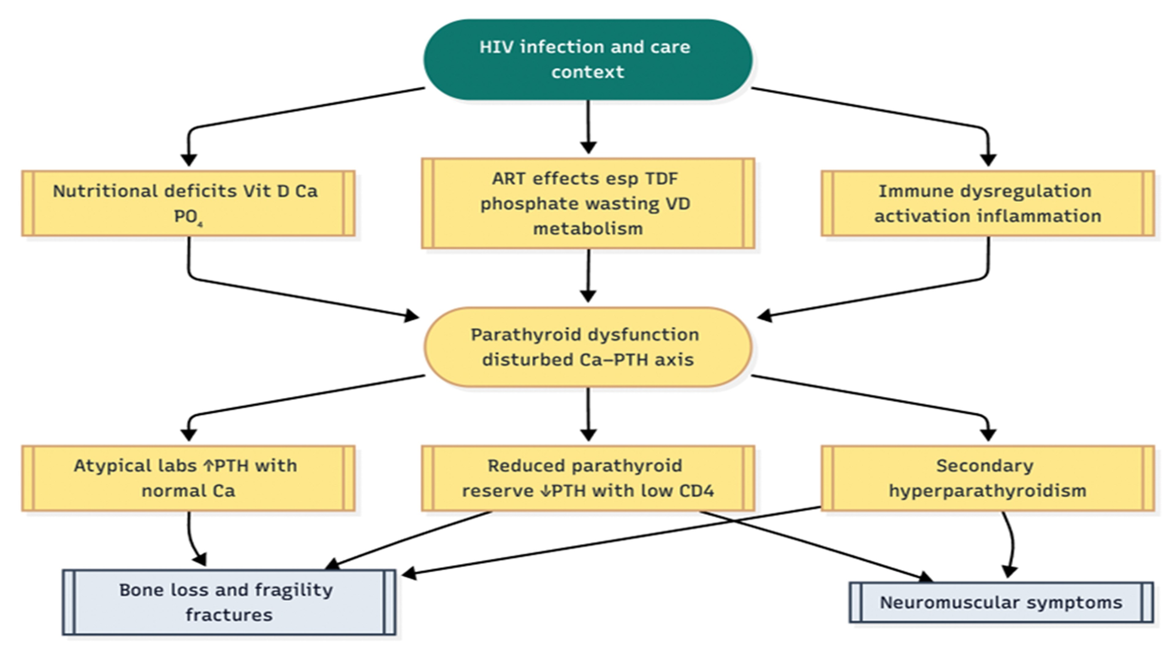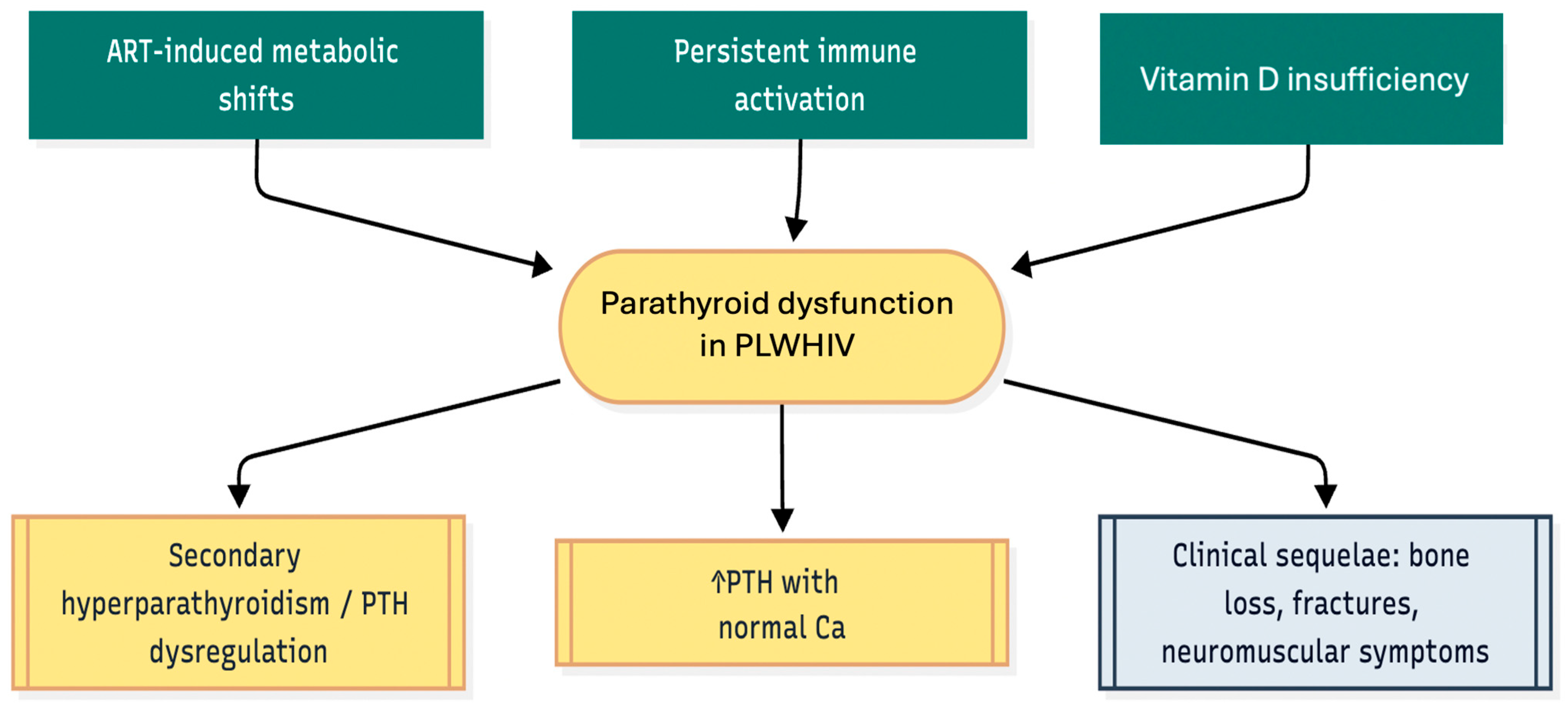 | Immunosuppression | Declining CD4 count correlates with decreased PTH secretion in HIV-infected individuals. | Decreased PTH levels observed in PLWHIV with low CD4 counts, implying impaired parathyroid reserve. | [12,13] |