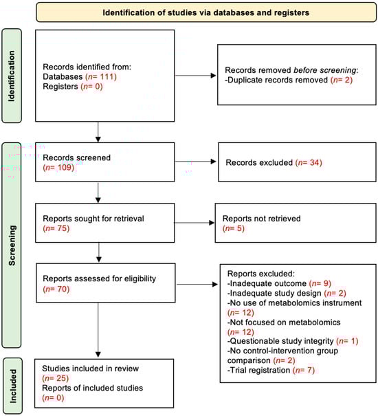 The flow diagram of the study selection process is shown in Figure 1. In the original search, 111 records were published from 2019 to 2024. Before screening, 14 records were removed: 2 duplicates, 7 trial registrations, and 5 records with inaccessible full text. A total of 97 records remained and were screened by title and abstract. Of these, 34 were excluded for not meeting eligibility criteria. The remaining 63 articles were assessed in full-text form. Among those, 38 were excluded for the following reasons: inadequate outcome (n = 9), inadequate study design (n = 2), no conventional metabolomics instrument used (i.e., methods other than MS or NMR) (n = 12), not metabolomics-focused (studies centered on biomarkers rather than direct metabolite profiling) (n = 12), questionable study integrity (n = 1), and absence of a comparison group between intervention and control (n = 2). Ultimately, 25 studies met all inclusion criteria and were included in the systematic review. Of these, 8 were crossover RCTs and 17 were parallel-group RCTs.
