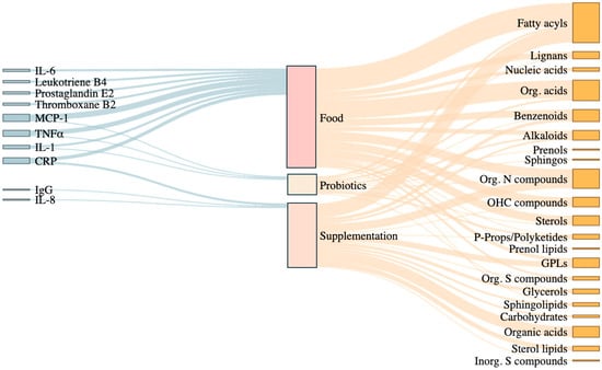 Sankey diagram illustrates the relationships between inflammatory biomarkers, dietary intervention types, and affected metabolite classes in the reviewed RCTs. The diagram shows the connections between key inflammatory biomarkers (e.g., IL-6, CRP, TNFα), the type of dietary interventions applied (Food, Supplementation, Probiotics), and the metabolite classes modulated in response. Food-based interventions are broadly associated with fatty acyls, organic acids, and nitrogen compounds, while supplementation and probiotics modulate particular classes of metabolites such as glycerophospholipids, benzenoids, and sphingolipids. The width of each flow reflects the frequency of associations reported across the reviewed studies, highlighting which metabolite classes are most consistently linked to dietary patterns and inflammatory outcomes. Org. Acids: organic acids; Sphingos: sphingolipids; Org. N compounds: organic nitrogen compounds; OHC compounds: organoheterocyclic compounds; P-props/Polyketides: phenylpropanoids and polyketides; GPLs: glycerophospholipids; Org. S compounds: organic sulfur compounds; Inorg. S compounds: inorganic sulfur compounds. Figure created using R (version 4.4.1) within RStudio (version 2024.09.0+375).