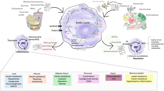The effect of food metabolites on inflammation. Unhealthy lifestyle exposures such as high-palatable foods rich in trans fats, cholesterol, oxidized LDL (low-density lipoprotein), nitrites, nitrosamines, and polycyclic aromatic hydrocarbons (PAHs) activate innate immune receptors (e.g., TLR2/4, NLRP3/6) and drive metabolic reprogramming toward aerobic glycolysis, accumulation of Krebs cycle intermediates (e.g., citrate, succinate), mitochondrial stress, and augmented reactive oxygen species (ROS) production. For instance, metabolites derived from saturated fats (e.g., palmitic acid → ceramides) promote M1 macrophage polarization and chronic inflammation. This, in turn, contributes to systemic complications such as insulin resistance, steatosis, and non-alcoholic fatty liver disease (NAFLD) in the liver; myokine alterations and lipotoxicity in muscle; adipokine imbalance, obesity, and excessive lipolysis in adipose tissue; β-cell failure and type 2 diabetes in the pancreas; atherosclerosis and cardiovascular disease; and leptin resistance, insulin resistance, and hypothalamic inflammation in the nervous system. By contrast, healthy dietary compounds such as vitamin C and flavonoids promote fatty acid oxidation and enhanced antioxidant capacity (via non-enzymatic antioxidants: vitamin C → ascorbate; or via antioxidant microbial metabolites: catechins → valerolactones), thereby favoring M2 macrophage polarization, which favors immune resolution and tissue repair. Furthermore, fermentation of dietary fiber by gut microbiota releases short-chain fatty acids (SCFAs) (e.g., fiber → butyrate), while microbial catabolism of polyphenols produces phenolic metabolites (e.g., bound polyphenols → ferulic acid). Both classes of compounds reinforce M2 macrophage polarization and anti-inflammatory pathways.