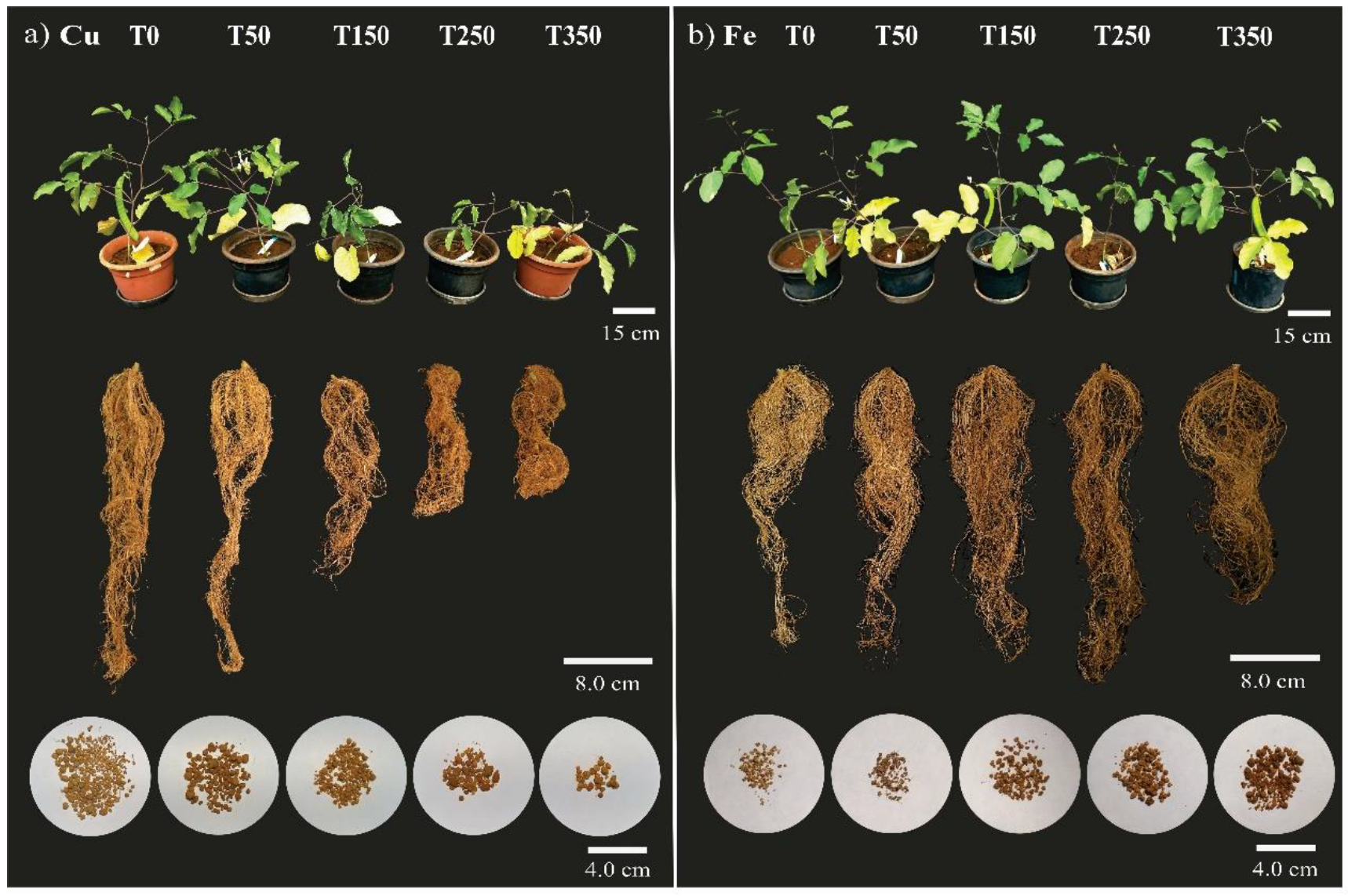2.7. Biomass and Estimation of Cu and Fe Content in the Plant