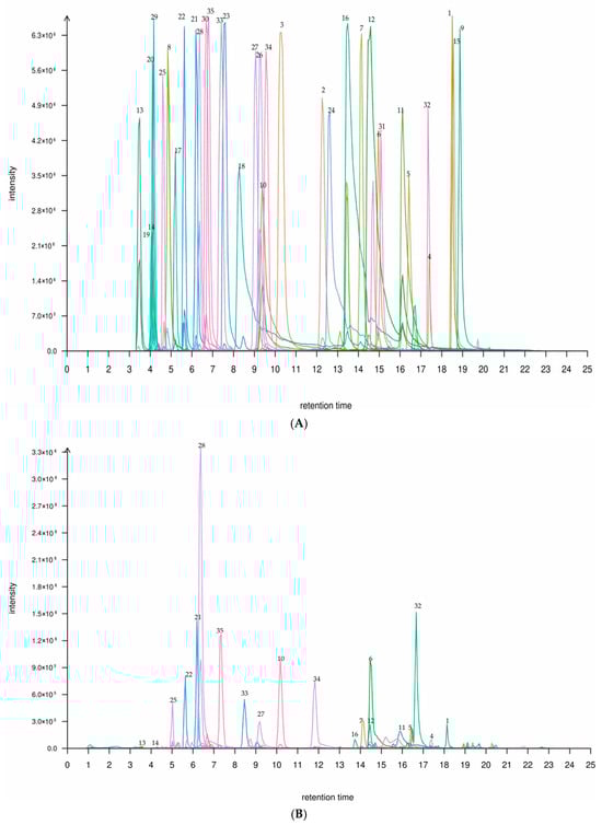 Qualitative and quantitative analysis of flavonoid components in P. amarus leaves and shoots was performed using liquid chromatography–tandem mass spectrometry (LC-MS/MS). As shown in Figure 1, A presents the total ion chromatogram of mixed labeling of 35 flavonoid compounds in the leaves and shoots of P. amarus, while panels B and C provide the total ion chromatograms for the leaf and shoot samples, respectively. Target compounds were preliminarily identified by comparing retention times (RT) with those of reference standards. Subsequently, multiple reaction monitoring (MRM) was employed, where precursor ions were fragmented into product ions in the collision cell to reduce matrix interference, and structural inference was conducted using the product ion mode. The collision energy (CE) for each compound was individually optimized, ranging from 15 to 45 eV, to generate the most abundant and specific fragment ions. By measuring the response values (peak areas) of reference standards with known concentrations, a linear calibration curve (y = ax + b) between concentration and response was established for calculating the absolute content of target compounds in the samples.