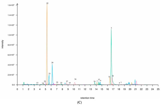(A) A TIC plot of mixed labelling of 35 flavonoids in the leaf and shoot of P. amarus. (B) A TIC plot of 35 flavonoid compounds in the (B) leaf and (C) shoot of P. amarus. Each number corresponds to the serial number in Table 1.